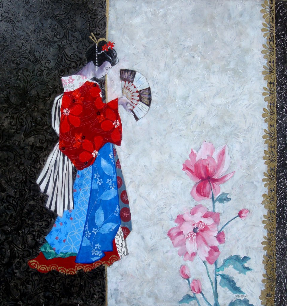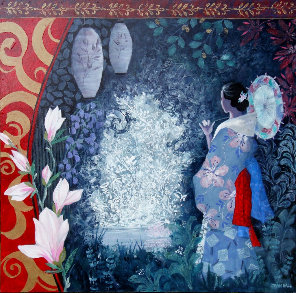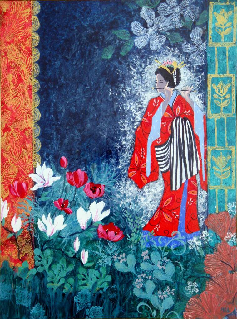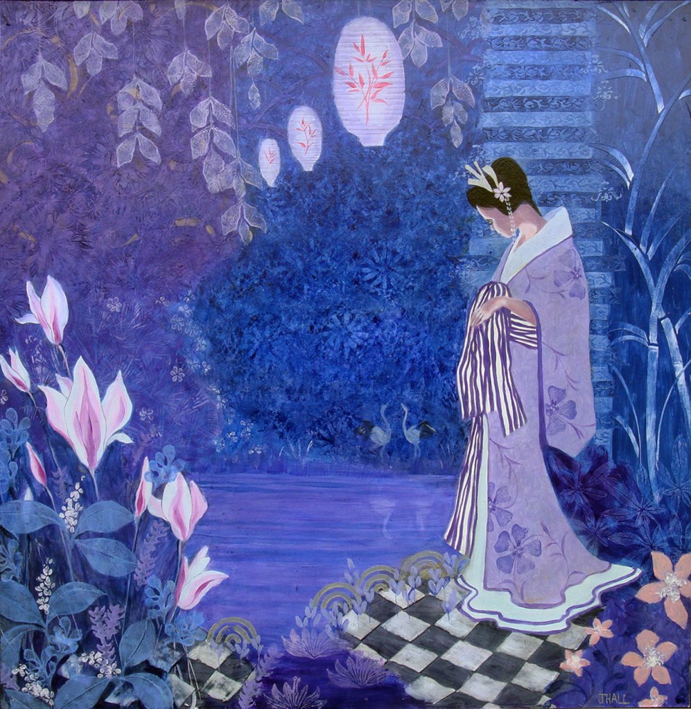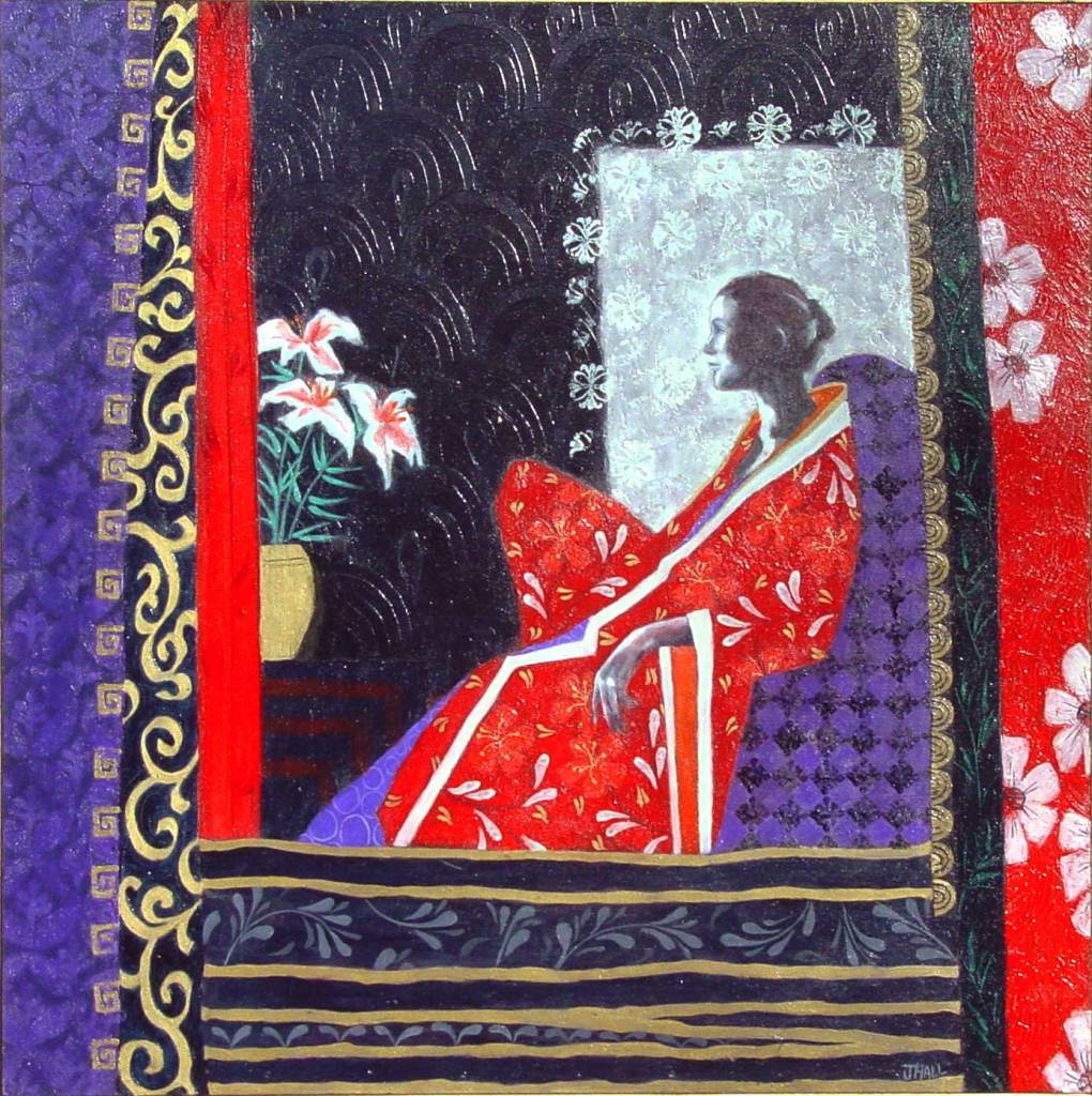 Yellow Kimono. 47 x 57 cms. £750Japanese Fantasy Garden. 60 x 60 cms. £750Enigma with Japanese Anemone. 67 x 97 cms. £1100Garden with Two Lanterns. 60 x 60 cms. £800Lady with Flute and Iris. 60 x 60 cms. £800Japanese Lady in Red. 51 x 47 cms. £750