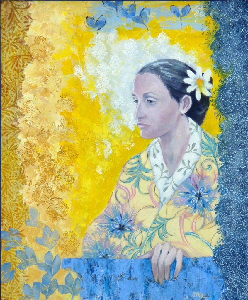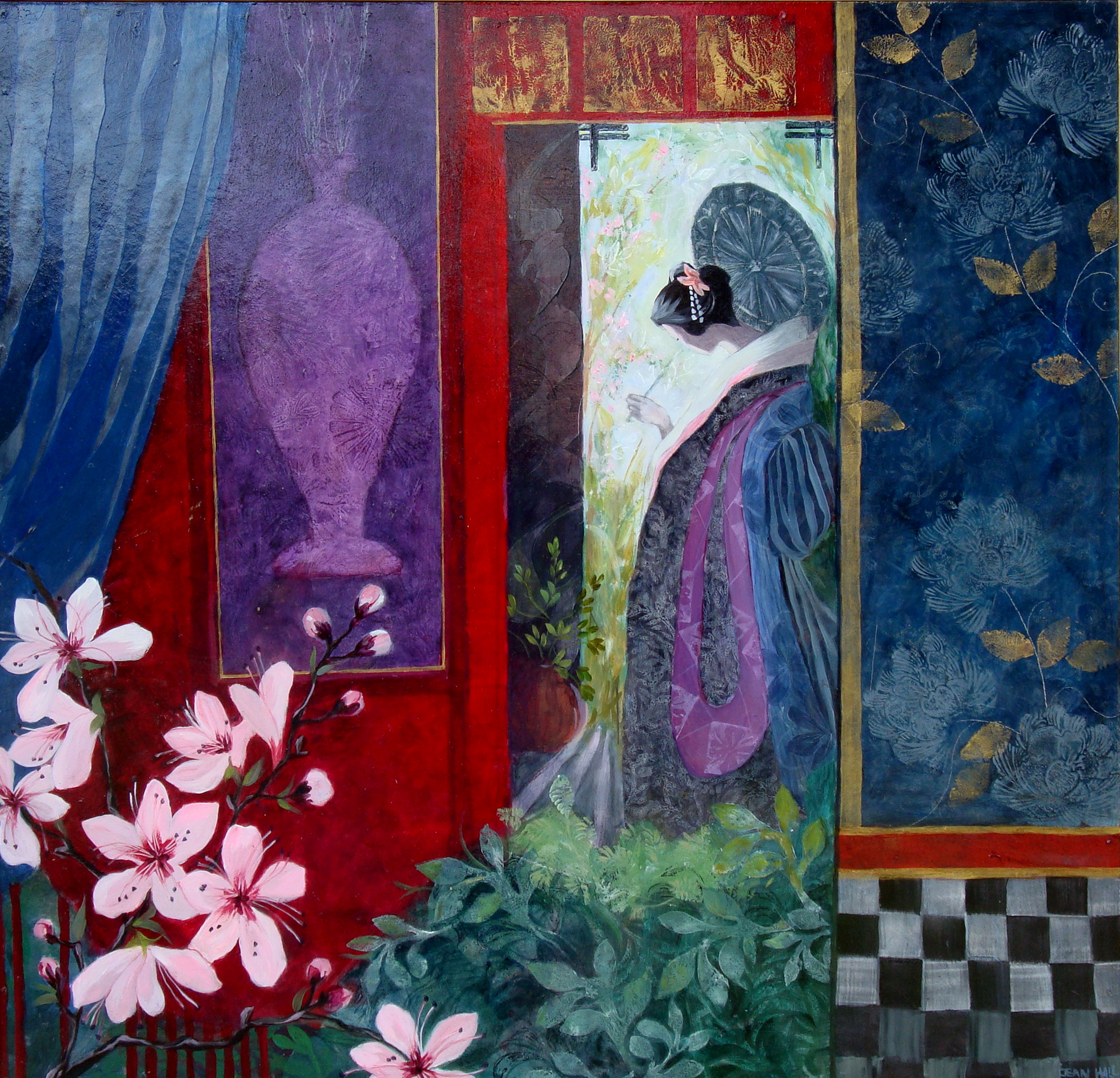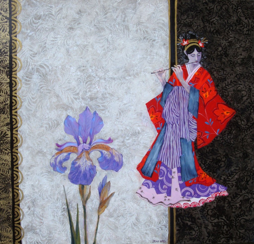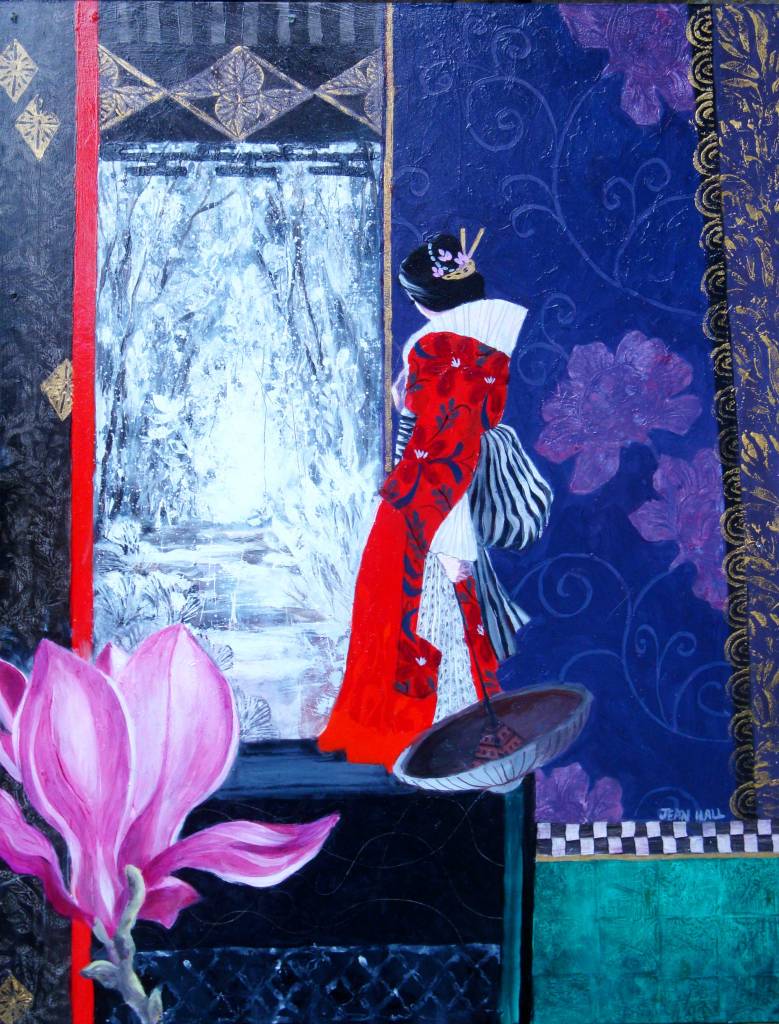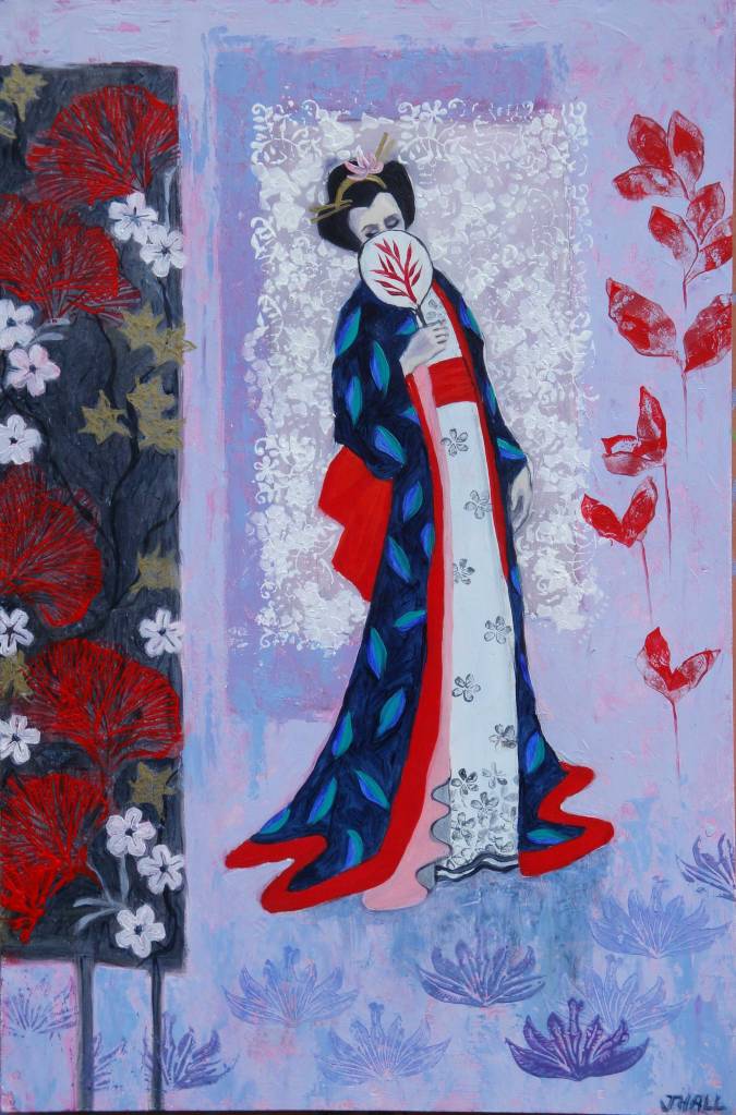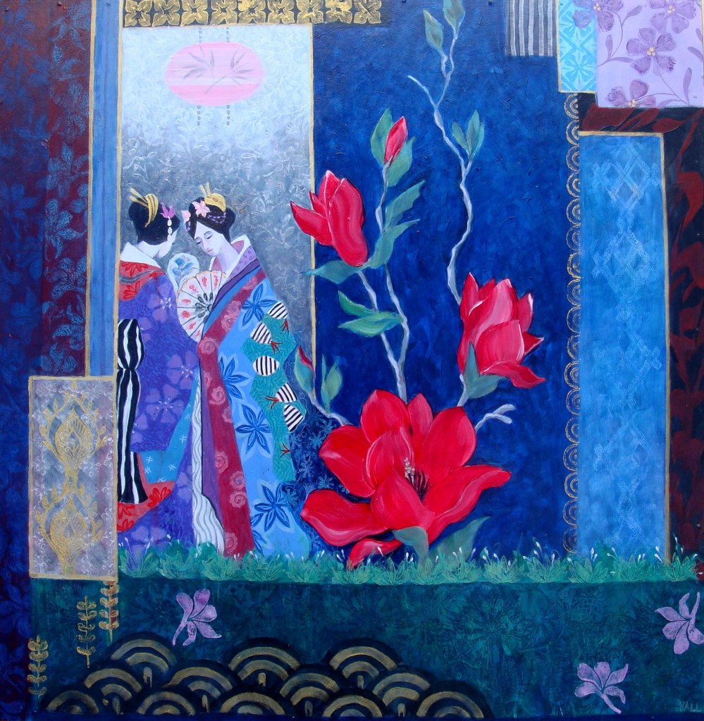Yellow Kimono. 47 x 57 cms. £750Japanese Fantasy Garden. 60 x 60 cms. £750Enigma with Japanese Anemone. 67 x 97 cms. £1100Garden with Two Lanterns. 60 x 60 cms. £800Lady with Flute and Iris. 60 x 60 cms. £800Japanese Lady in Red. 51 x 47 cms. £750