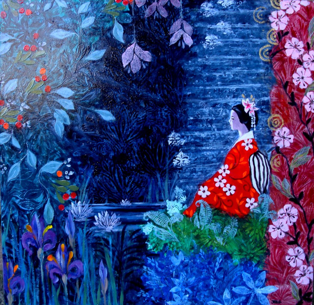 Girl in a Red Kimono. 60 x 60 cms. £600Kimono Garden. 67 x 52 cms. £580Music in a Garden. 36 x 48 cms. £750Secret Garden. 60 x 60 cms. £800Lady with Anemone. 60 x 60 cms. £800Silence and Solitude II. £800