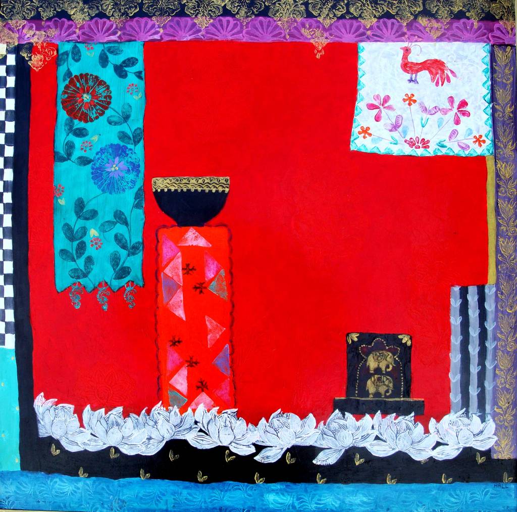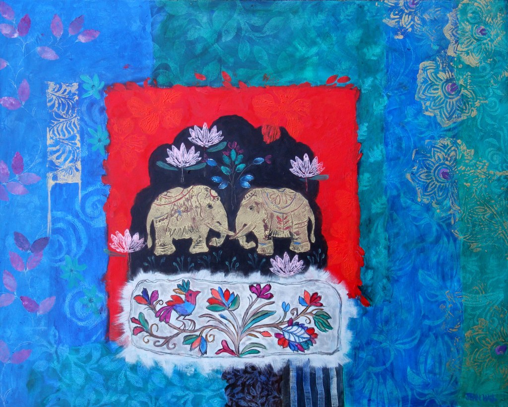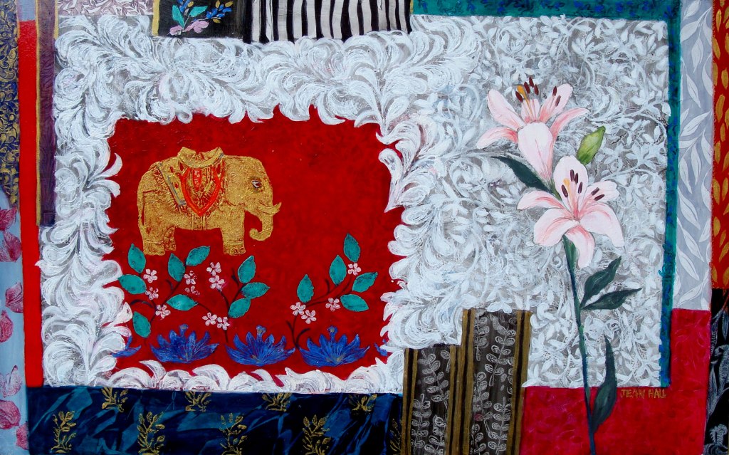 Two Elephants and a Peacock. 60 x 60 cms. £800Magnolia and Red Table. 60 x 60 cms. £800Magnolias in a Red Garden. 65 x 46 cms. £600Elephant and Lily. 41 x 51 cms. £