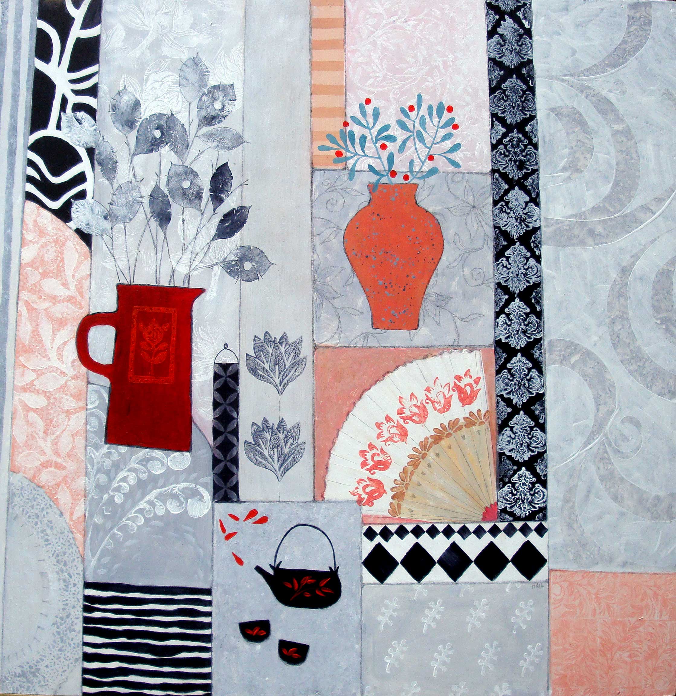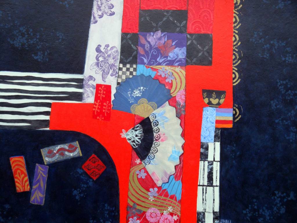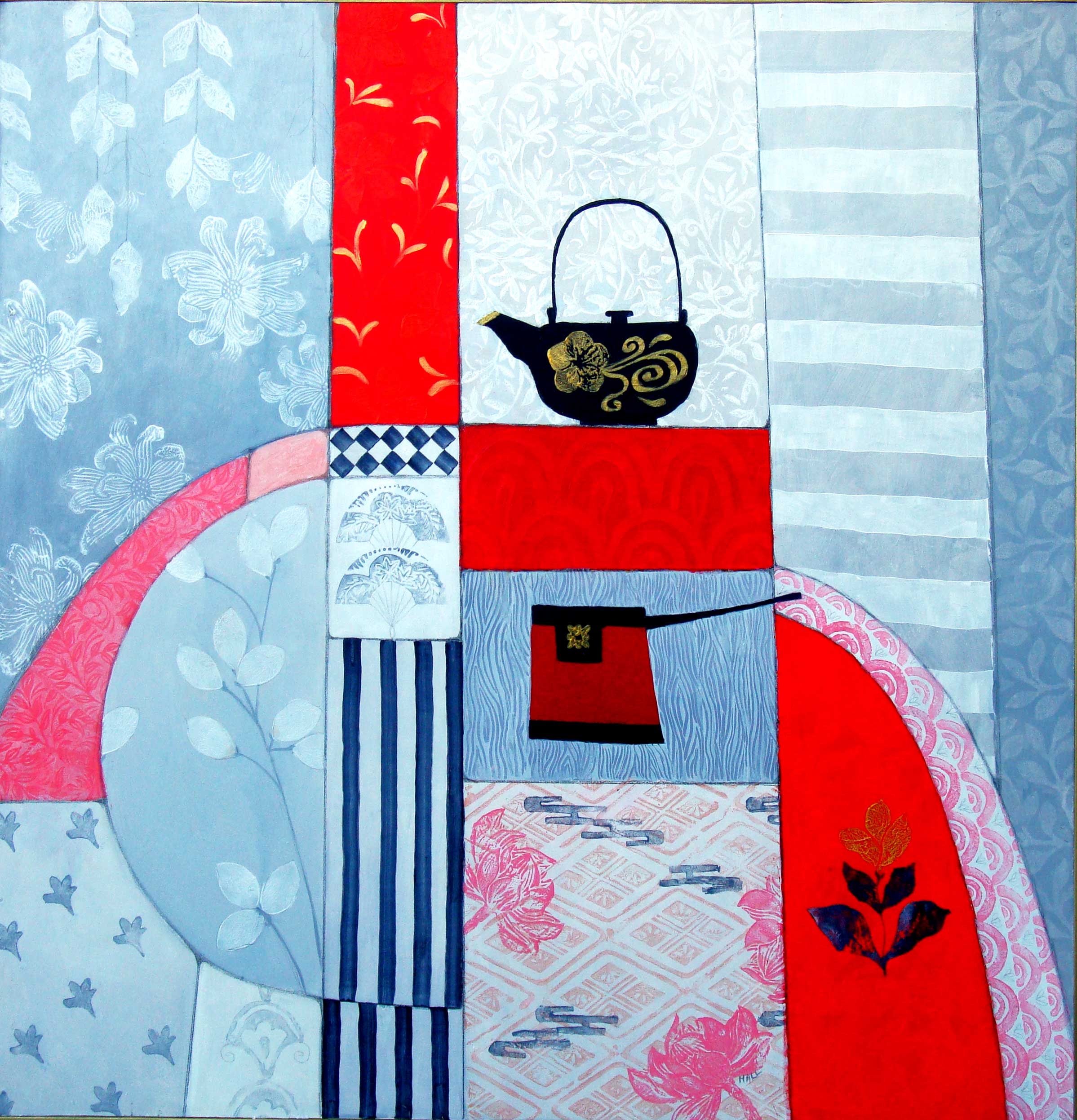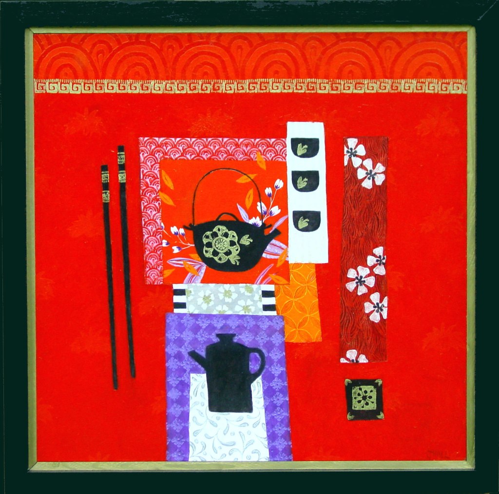 Two Golden Elephants. 60 x 60 cms. £750Pale Japanese Arrangement II. 60 x 60 cms. £700Blue Table with Fans. 75 x 52 cms. £700Arrangement with Three sake Cups. 60 x 60 cms. £700
